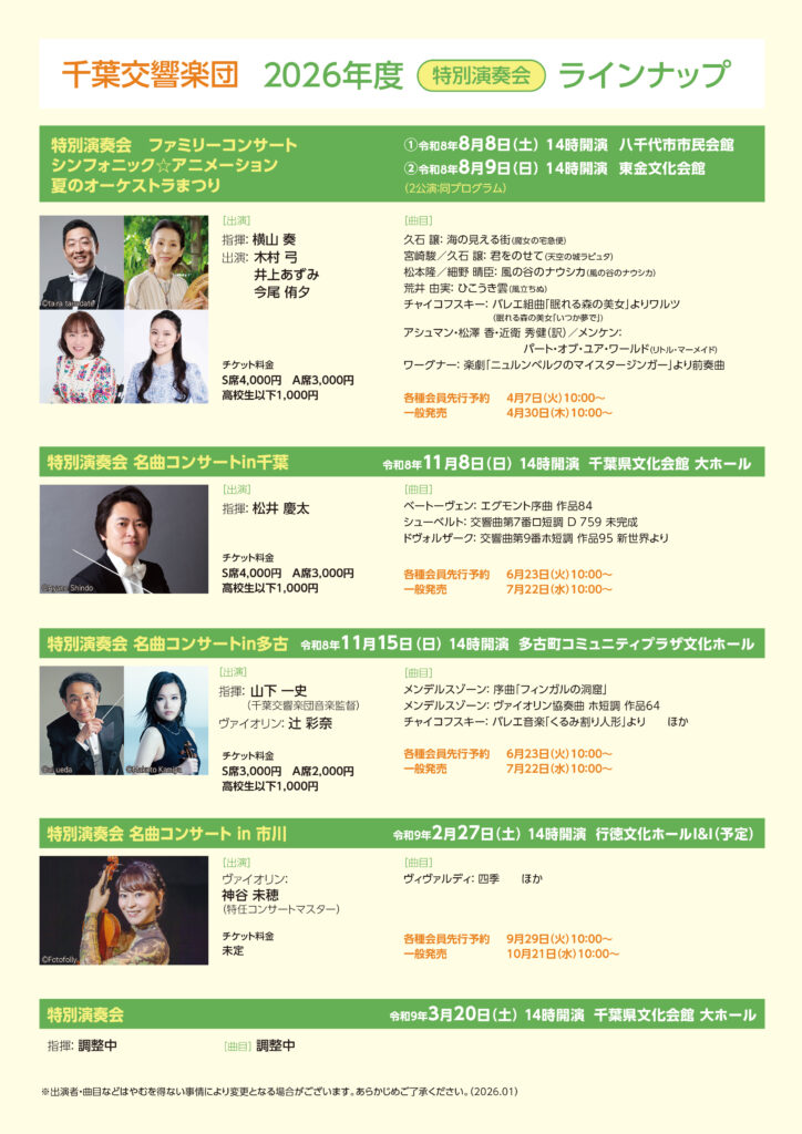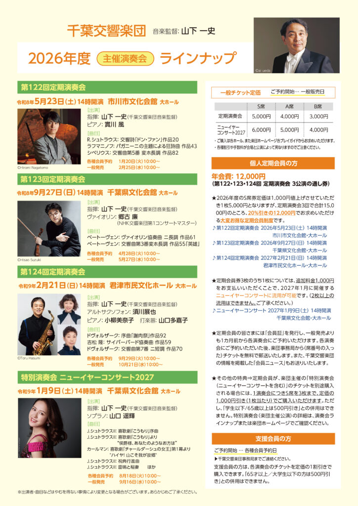 千葉交響楽団 2026年度(2026.04~2027.03) 主催公演 全10公演を発表します。