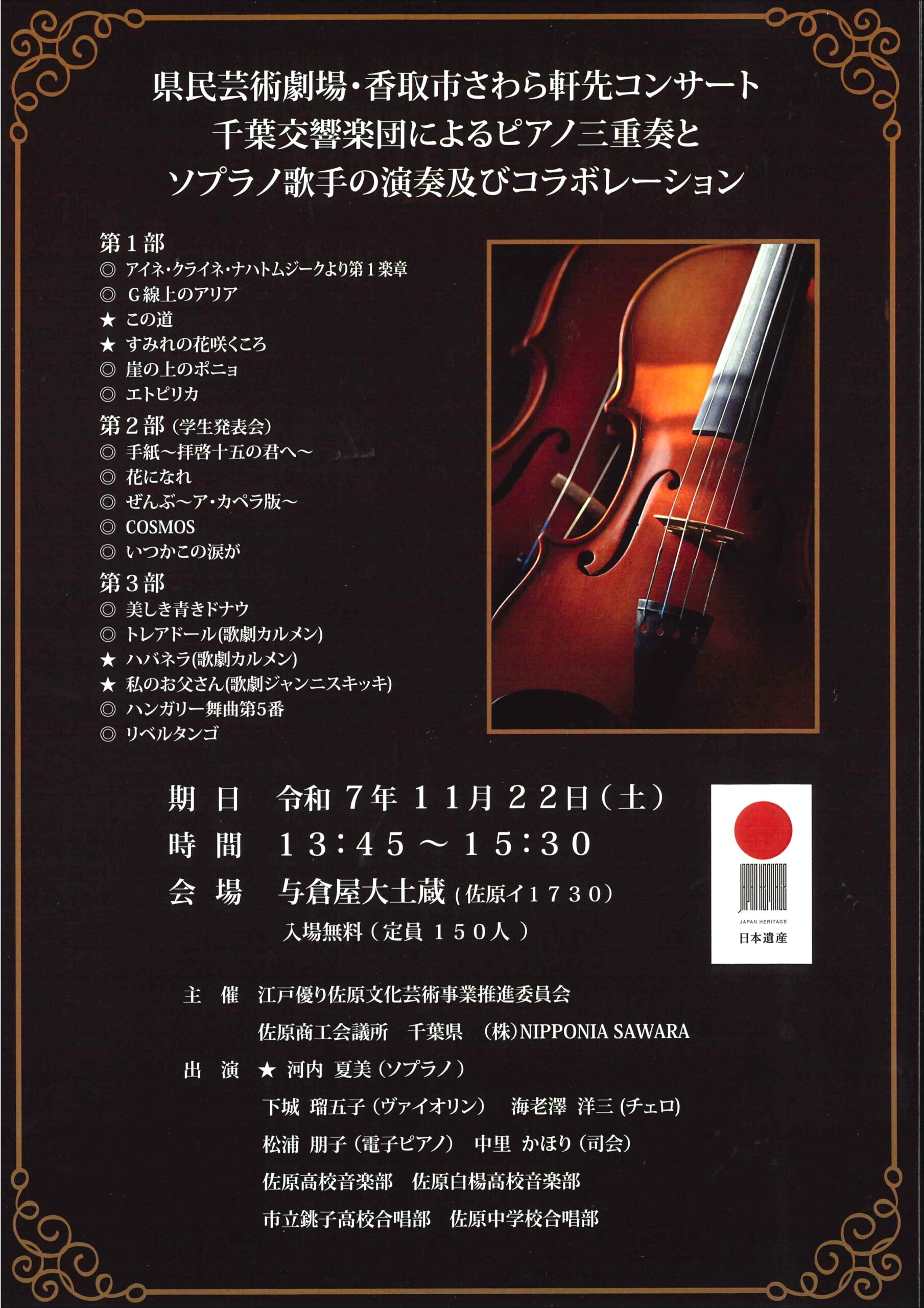 その他の演奏会 令和7年度県民芸術劇場公演・香取市さわら軒先コンサート 千葉交響楽団によるピアノ三重奏とソプラノ歌手の演奏及びコラボレーション